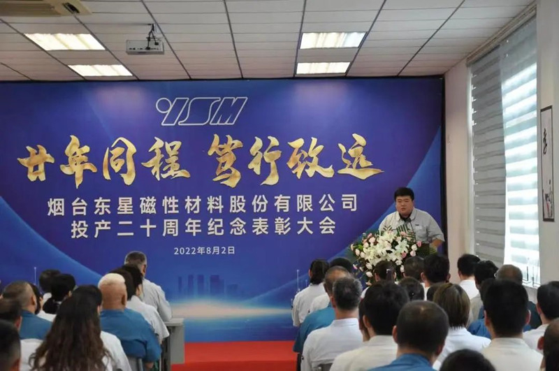 8月2日上午,主題為“廿年同程、篤行致遠(yuǎn)”的煙臺(tái)東星磁性材料股份有限公司(YSM)投產(chǎn)20周年紀(jì)念表彰大會(huì)隆重舉行。東星集團(tuán)董事長(zhǎng)、總經(jīng)理于大偉,YSM總經(jīng)理丁開鴻及全體中干、員工代表等130余人參加了會(huì)議。會(huì)議由YSM副總經(jīng)理付連寶主持。